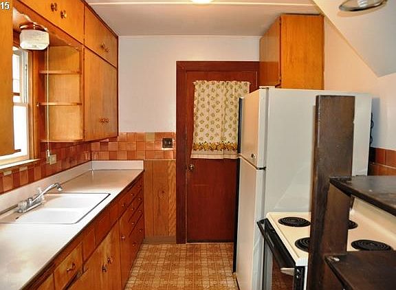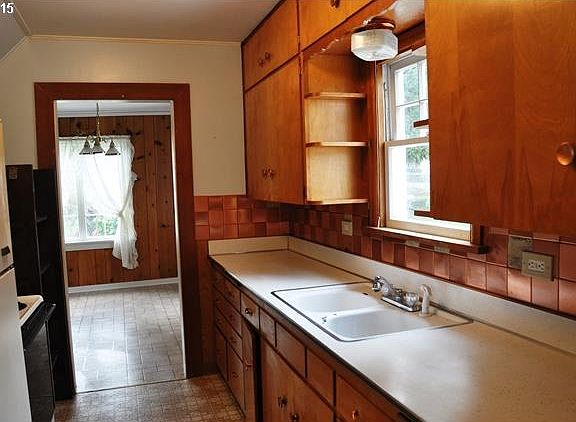 Quaint older home with wood floors, knotty pine paneled living and dining rooms, remodeled bathroom, spacious upstairs bedroom area (short ceiling height). Attached storage building. Huge 100 x 124 lot with garden or play space. Fresh exterior paint.