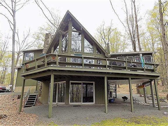 Pride of Ownership in this Meticulously Maintained 3Br, 2 Bath Prow-Front Chalet with Dock Slip on Lake Wallenpaupack in Very Private ''Pennwood on the Lake''! First Time Offered For Sale! Situated on an Oversized .68 Acre Fully Landscaped Lot, this home boasts an Open Floor Plan; L R w Stone Fireplace and Hardwood Flooring; Eat-In Kitchen w Newer S S Appliances; Gorgeous 4-Season Room w Plenty of Glass Views; Spacious Master Suite w Propane Free Stand Fireplace and Her's and His Walk-In Closets and Walk-Out Balcony; Master Bath w Her's His Vanity Sinks, Spa Jetted Tub plus Steam Shower, Separate Commode Bidet and Wash Dryer; Full Walk-Out Basement w 2nd Washer Dryer; 2-Car Att. Garage; Wall A C w Heat Pump and Propane Heaters on All Floors. A short Golf Cart Ride to your Dock Slip and Private Beach!