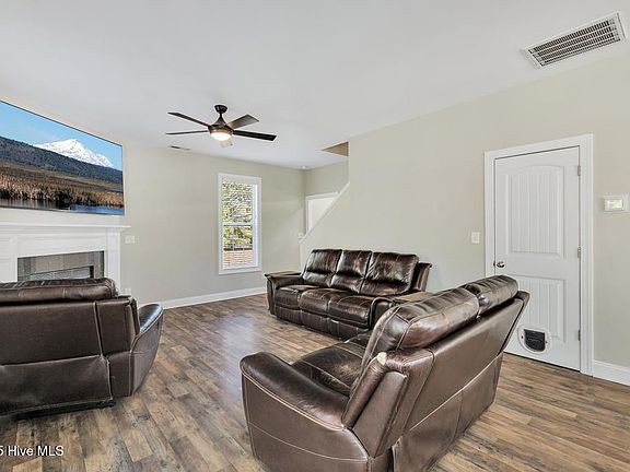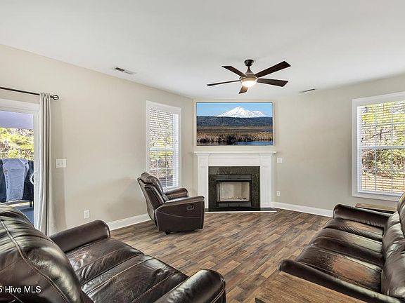 Welcome to 114 Neptune Court, a stunning 3-bedroom, 2.5-bathroom home nestled at the end of a peaceful cul-de-sac in a secluded private waterfront community. Built in 2014 and immaculately maintained, this home offers modern features and thoughtful design. The first floor boasts LVP flooring throughout, while the half bathroom showcases gorgeous tile. The family room is warm and inviting with a cozy gas fireplace in the corner and glass sliding doors leading to the patio, filling the space with natural light. The eat-in kitchen is a chef's delight, complete with stainless steel appliances, a food pantry, ample counter space, and a breakfast bar for extra seating. Upstairs, the spacious master bedroom features a walk-in closet and an ensuite with a dual vanity, linen closet, and a tub/shower combo. The bright bathroom is enhanced by marble-look tile flooring for a high-end feel. Two generous guest bedrooms also feature walk-in closets, offering plenty of storage. Step outside to enjoy the large, fully fenced backyard, which includes a charming firepit with built-in benches and a swing, perfect for gatherings. Located just 12 minutes from the main gate of Cherry Point Air Station and a short drive to the Crystal Coast beaches, this home is ready for its next owner. Don't miss out on this incredible opportunity!