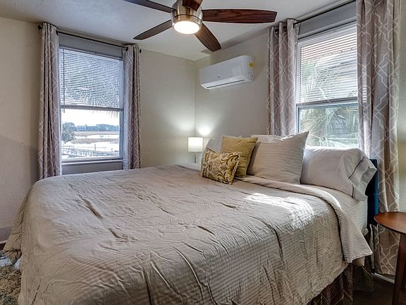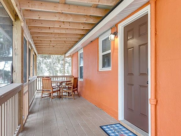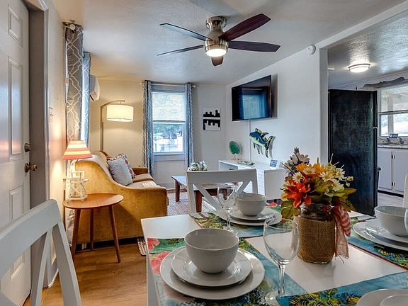 Welcome to this charming one-bedroom, one-bath studio at Retro Rainbow Herb River Hideaway. Feel at home in this cozy upper-level apartment that accommodates up to four guests with a king-size bed and a queen-size pull-out sofa. Enjoy the screened-in deck and the soothing sounds of the nearby marsh. Located just 8.5 miles from downtown Savannah, a scenic 30-minute drive will take you to beautiful Tybee Island. Located on the upper portion of a duplex, you will access the entire upper-level studio apartment once you have navigated a flight of stairs. The apartment features an open concept living style with a large flat-screen TV complete with Roku and a couch that pulls out into a queen-size bed. The kitchen is stocked with all your basics to help you settle in and cook a meal, and off the kitchen is a quaint dining table with seating for four. In the bedroom, you will find a king-size bed as well as a stackable washer and dryer for use during your stay. The bathroom is newly updated with a large walk-in shower. The fully screened upper-level deck has a small table and chairs, perfect for your morning coffee or relaxing and enjoying the southern marsh vibes. Two parking spots are available for guests in a private sand parking area next to the marsh. Free Wi-Fi is available and the apartment is pet-friendly with a fee. We have a community game area with a great deal of seating and a grill, which includes games such as volleyball, corn hole, ladder toss, and more. Our location on the marsh provides the perfect backdrop for what makes Savannah so charming, with large mature trees dripping in Spanish Moss and breezy nights. The apartment is close to dining, shopping, and adventure. We recommend driving and offer parking for our guests, however, Uber and Lyft service the area as well. The house has a digital combo lock pad, and you will be provided with the code upon check-in. Check-in and check-out are automated and contact-free to provide maximum privacy and flexibility. Pets must be crated when left unattended in the home, are not allowed on furniture or beds, and all waste must be cleaned up from the yard. All pets require a non-refundable pet fee. If there is evidence of pet hair on the furniture, excess hair in the home, stains, or waste found in the yard or home, you will be charged the cost to clean this.