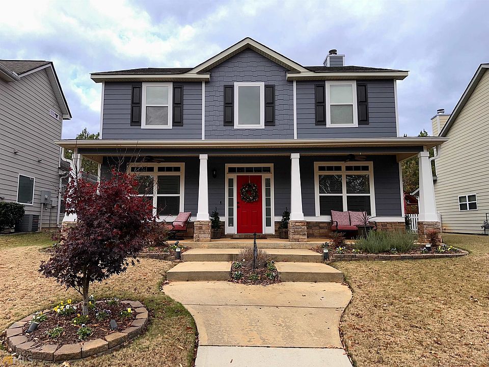 Welcome to this open concept home in beautiful Newnan Lakes. This home is located directly across from a park with a playground, walking trails, and lake. And not to mention, minutes away from retail therapy in Ashley Park! Get ready to be greeted by a bright red front door and a cozy porch to sip your morning coffee. Once inside, you will be mesmerized by the formal dining room with exposed beams and a glorious chandelier hanging in the two story foyer! You'll find extra storage tucked in under the stairs. The bedroom on the main is connected to the full bath. Around the corner lays a large family room with a gleaming fireplace and connected kitchen with hardwood floors and granite countertops. Enjoy LED lighting and kitchen storage space for all of your appliances and goodies! One step out the backdoor lays a fantastic outdoor space for entertaining complete with picket fenced back yard and a wood-burning stone fireplace, perfect for those gamedays! Moving upstairs, you will be greeted with a loft space, two more bedrooms, a full bathroom, and an oversized master suite. The upstairs laundry room happens to be connected to the master closet as well! The master bedroom features large windows, tray ceiling, and an oversized closet with custom shelving. The master bathroom has a separate shower and bath tub with lots of natural light, along with a double vanity. This home also includes energy efficient upgrades: attic tent, solar roof ventilator, a new HVAC, furnace, and ductwork. Outside of the home, a French drain is installed along the property line with underground gutters. Power out and need to access the garage? The two car garage is equipped with a battery backup system and exterior keypad! This home truly is a one of a kind find with all of the amenities inside and outside that you'll ever need! Make an appointment today!