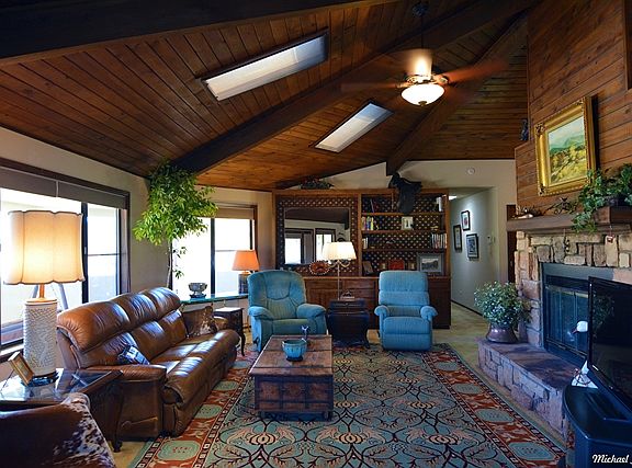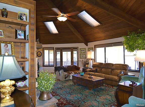 Cree Meadows Gold Course Home with huge Sierra Blanca views, 3 Bedrooms/2baths - handicapped accessible. Large living room with Barrel wood ceiling & fireplace -gas log. Large Back courtyard/covered patio, refrigerated air. Furniture Addendum, newer appliances, carport - mostly zeroscaped. Storage room off carport