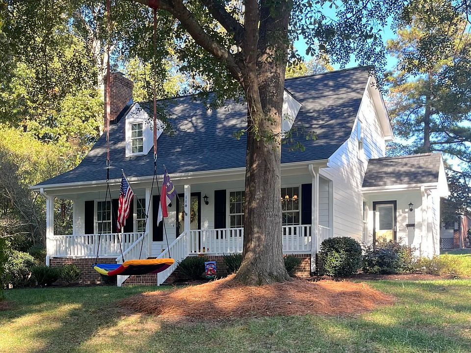 Picture book story home in Historic Downtown Fuquay Varina! Imagine beginning your quiet mornings on your rocking chair front porch with coffee and nature, and finishing your evenings with friendly waves from neighbors strolling by. This Charming home has 1508 sqft with 3 bedrooms, 2.5 baths and is nestled on almost a half acre lot. It also has a spacious Living room with a Cozy gas fireplace. The Updated Kitchen features stainless steel appliances and granite countertops for modern style. Separate Dining room perfect for casual or formal entertaining. The detached garage has a Large work bench ready for all your outdoor tasks and provides extra room for hobbies, storage, or a creative flex space. Parking and access could not be any easier with your circular driveway encompassing the property. Have the best of both worlds with tranquility at home while being within walking distance to local shops, dining, entertainment and community events. 2025 IMPROVEMENTS include brand new Roof, Painting inside and outside, New Carpet, New Outside Lighting Fixtures and Driveway. HVAC replaced in 2018.