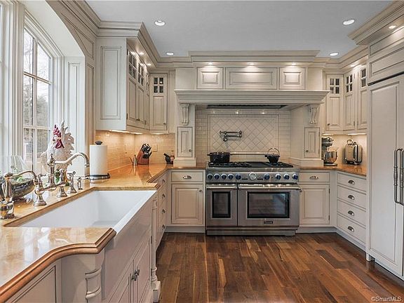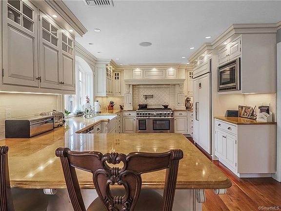 Located on a quiet cul-de-sac in desirable lower Weston, this classic center hall colonial located on over two acres of parklike properties is truly move-in ready! From the moment you enter you will notice the exquisite and extensive details throughout.The main level makes day-to-day living a breeze with a large eat-in gourmet Kitchen equipped with top of the line appliances, cherry wide-plank flooring, wine cooler, separate ice maker, pot filler, Thermador 48â six burner range with double ovens an-ceiling speakers make it ideal for relaxing family meals.The gorgeous, light filled Family Room with vaulted ceilings and stone fireplace is ideal for game nights, movie nights, or hot chocolate and a fire during the colder months. In the warmer months open up the doors to let a cool breeze trickle in or enjoy your coffee with a dose of the sound of nature or music from the outdoor speakers on the Bluestone and fieldstone terrace with built-in three zone/rotisserie Lynx grill and refrigerator, a separate raised fire pit area overlooking the picturesque property.Retreat upstairs to a Master Bedroom Suite and spa-like bathroom with jacuzzi tub and heated towel racks and have family or guests stay in the remaining 3 large BRSLooking for a little more fun? Head down to the finished lower level that can be used for a gym, recreation, media or game room with plenty of storage.And if all this isn't enough, there much more. Ask for full list of features.Truly a must see.