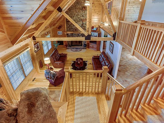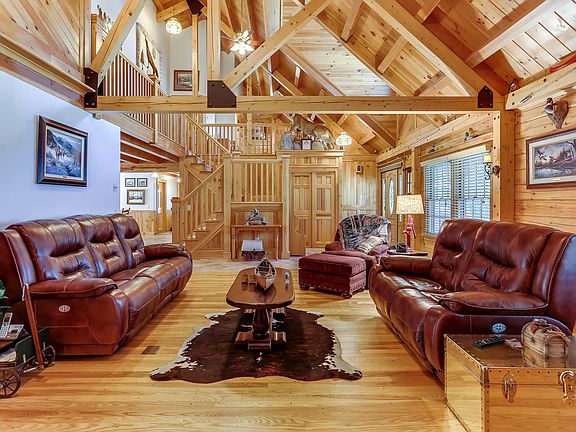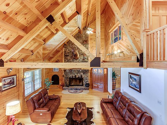 This property truly is a retreat from the world. Nestled on 10 private acres bordered by a classic stone wall, this exquisite log cabin offers a tranquil and secluded lifestyle. The property is a real sanctuary, featuring multiple outbuildings, a serene fountain, and a magnificent front deck that wraps around the home, perfect for enjoying stunning sunsets. A separate rear deck provides a quiet spot for morning coffee and sunrises. Inside, the home embraces an open-concept design with soaring ceilings and exposed wood beams that create a warm, inviting atmosphere. The rich, natural wood is complemented by an abundance of natural light from large windows and arched dormers, ensuring the interior is never dark. The living room is the heart of the home, dominated by a majestic stone fireplace that reaches toward the cathedral ceiling. A wide, lofted balcony overlooks this space, adding to the feeling of openness and connection. The seamless flow continues into the dining and kitchen areas, where beautiful wood cabinetry and granite countertops offer both rustic charm and modern functionality. With three bedrooms and three bathrooms, the home provides ample space for family and guests. The bathrooms continue the log cabin feel with wood vanities and trim, including a large soaking tub perfect for relaxing. A unique lofted space with a built-in window seat and cabinets provides a cozy nook for reading or quiet contemplation.