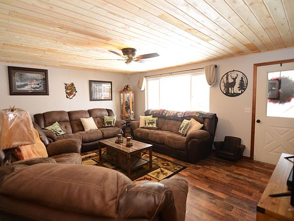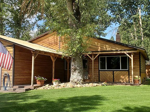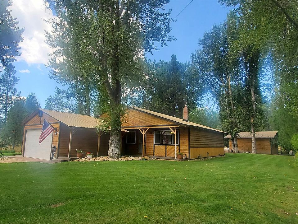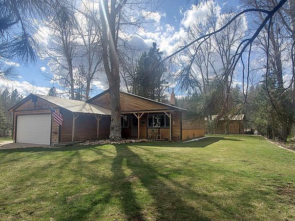 Cute single level on almost 3/4 acre in town but still has that "in the mountains" feel! Greeted by the nice sized front porch and inside with newly installed rustic pine ceiling and easy care laminate flooring (less than 2 years old). Kitchen with tiled floors, less than 2 year old stainless appliances, pantry, dual sided cabinetry over the bar for easy access, lots of counter space plus a cozy stove (gas/propane) in the center of the eating area, kitchen and living rooms. LARGE master w/door to the exterior and private bath and closet. Finished garage with extra long driveway. Out back you have plenty of space for entertaining/fun, RV parking and finished shop with space for 3 cars, electricity, shelving and an attached "shed" (not included in measurement) for additional storage. Access (and plenty of parking) from the back of the property to the shop and backyard. Views to the East and close to school and town-perfect!