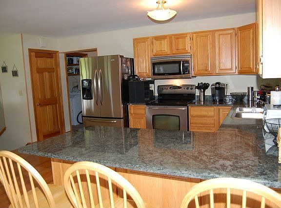 Bright and open design, kitchen has granite countertops and upscale stainless appliances. The fireplace is located to benefit both the dining and living areas and has exceptional granite detailing. Master bedroom has its own bath and a giant walk-in closet. Central air and first floor laundry. Downstairs game room has lots of windows, woodstove on a brick hearth and a wet bar.