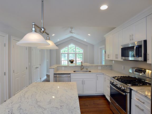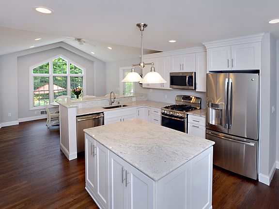 Ranch style home has been totally renovated! Nothing to do but unpack! Rocking chair front porch welcomes you home. Nice open floor plan. LR w/ bow window & WBFP & flows into a fabulous EIK w/ white cabinetry, center island, breakfast bar, granite counters & S/S appliances. Breakfast room overlooks a stunning backyard w/ multi-tiered paver patio & walkways. Family room features beamed ceiling, WB stove & wet bar for entertaining! Formal DR room w/ custom woodwork & glass doors lead to backyard patio. MBR suite boasts a private MBA, WIC & bonus loft w/ palladium windows & skylights - perfect for home office. Beautiful HW flooring, custom woodwork & decorative moldings. Meticulously manicured grounds, professionally landscaped. Finished walk-out basement, 2-car garage & workshop. Must see!