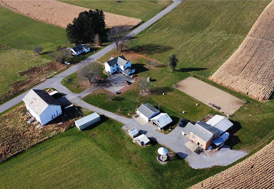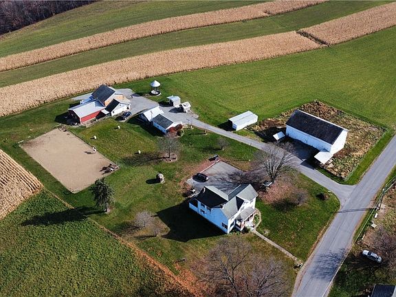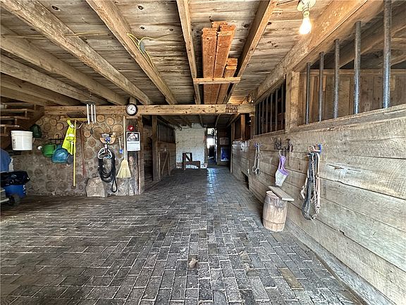 Gorgeous rolling land over 69+ acres with a stocked pond, 3000+ SF 4BR home, 8 stall horse barn with hay storage above, 2 car detached garage with bathroom, cow barn with hay/equipment storage, fenced pasture area, crops. First floor of home has BR, full bath, eat-in Kitchen,Living Room with built-in desk, and large laundry room. Second floor has 3 BRs (2 of them have private half baths), plus a full hall bath with tub/shower. Full basement has gas furnace and electric back up furnace, UV light water treatment system. Great opportunities for income from crops and/or horse boarding.