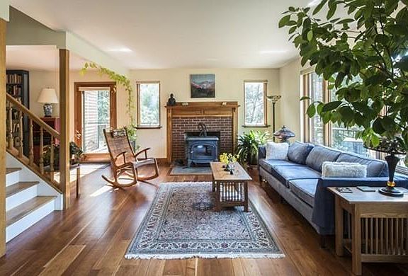 Light-filled, open, & airy with stunning views, this energy-efficient 3-br 3-ba home is a peaceful retreat yet just 15 minutes to UMass. Exquisite details throughout, including local ash floor in the kitchen, cherry floors & mantel in the living area, great built-ins, & Goshen schist windowsills. Step out onto the wraparound deck overlooking the river down below, or relax on the screened-in sleeping porch out front. Upstairs bedrooms are spacious & bright. Active & passive solar keep energy costs down, along with a main-level Mitsubishi mini-split that heats & cools, and a lovely Hearthstone wood stove in the living room. Lower level includes a bonus room with walk-out access, a workshop, & a storage area! There is also an unfinished room over the garage with lots of storage space. Gardeners will love the organic gardens with soil that current owner has developed carefully over the years. Connection for generator or electric car in garage. This is an exceptional home.
