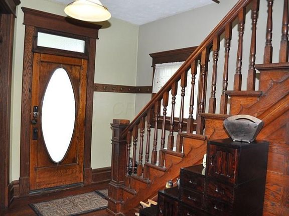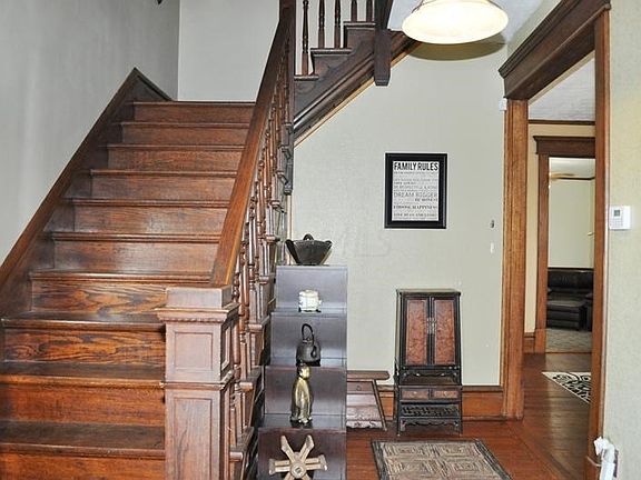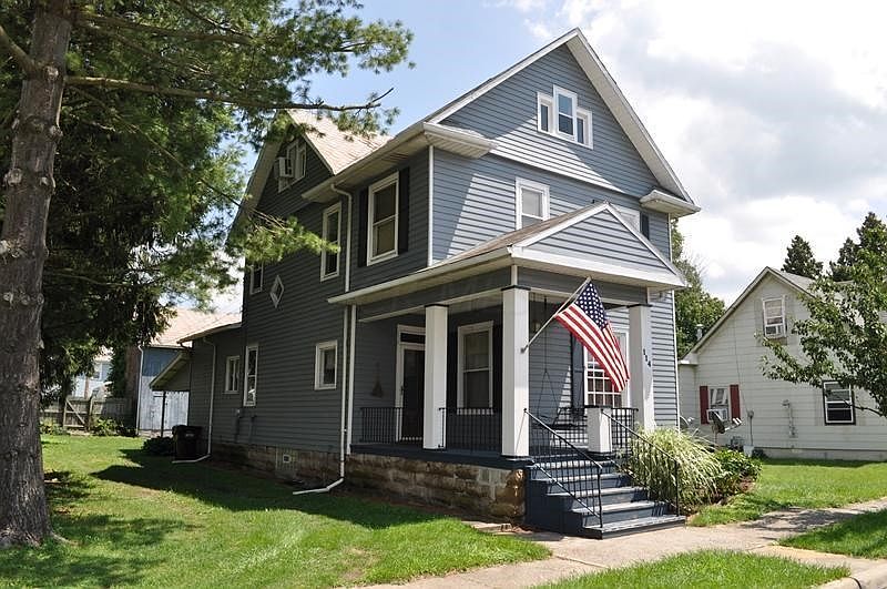 Original character & charm w/updates throughout! You'll love the inviting front porch that opens into the foyer featuring intricate wood work, a grand staircase, & hardwood floors. The living room is accented w/a gas log FPLC & pocket doors leading to the formal dining room. The eat-in kitchen is equipped w/new dishwasher, new double ovens, new microwave, & access to the covered patio. Convenient 1st floor 1/2 bath. 2nd floor provides 3 generous bedrooms & a full bath. As you continue up to the 3rd floor it's finished as an office/den/possible 4th bedroom! Outside offers a large covered back patio - perfect for hosting a BBQ - a fenced backyard & 2 story barn w/room for a wood shop or mechanic. Situated only blocks from the local swimming pool, park, library, & parade route! Welcome Home!