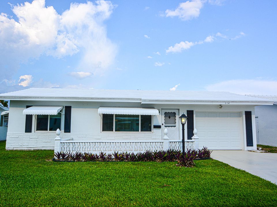 Lovely 2Br/1Ba Fairmont model with thousands in upgrades. Hurricane impact windows. Large picture hurricane impact window in Living room and both bedrooms and bath all hurricane impact. Neutral tile on the diagonal thru out. Kitchen cabinetry refaced with updated appliances. Enclosed porch. Roof replaced plus Southern Coating for sealer and insulation. Lennox Ac 2016. General Electrical Panel box. Double concrete drive plus front porch. Updated bath with walk in shower. FRESHLY PAINTED...Paid up recreation lease in full. Minutes to ocean beaches, shopping and restaurants. Active community with FREE 18 HOLE GOLF PAR 3, 3 heated pools and 3 clubhouses. Vacant for quick Close..Some rooms virtually staged for photos