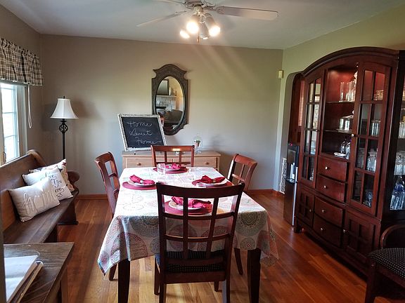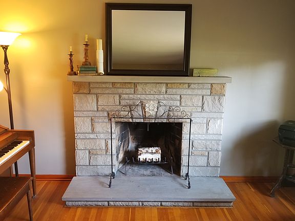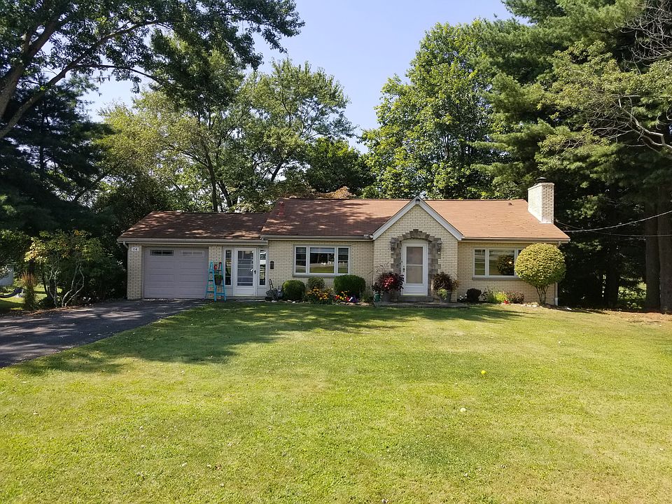 Adorable, charming 3 bedroom ranch on over an acre! This beautiful home features hardwood floors throughout, a gorgeous stone fireplace in the living room, large picture windows in the living room and dining room, finished game room in basement with brick fireplace, huge laundry room, storage room and a rear single car garage/shed used as additional entertaining space! The breezeway between the home and garage creates a charming space and doubles as a mudroom. New garage door on 1 car attached garage. Low maintenance deck off breezeway overlooks the large, table top lot with mature trees! A must see!