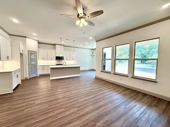 This 4-bedroom, 3-bath home sits on over half an acre on a quiet cul-de-sac and offers 2,025 square feet of thoughtfully designed living space. The open layout features luxury vinyl plank flooring throughout and custom cabinetry. The living area includes an electric fireplace and flows into a kitchen with quartz counters, a designer tile backsplash, under-cabinet lighting, a walk-in pantry, plenty of storage, and a breakfast bar for casual dining.