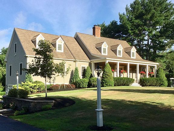 The open floor plan, 9 foot ceilings, expansive dining room, and beautiful large covered mahogany front porch make this 4200 SF, 4 bedroom, 2.5 bath expanded Cape style home ideal for entertaining and taking in the beautiful surroundings. The gourmet kitchen, finished in high end cabinets, granite counters, and stainless steel appliances, is open to an elegant two story family room with impressive fireplace. The french doors open onto another mahogany deck which provides the perfect perch to view the large manicured, private, tree-lined landscape, ideal for playing ball, entertaining or a future pool. The generous dining room is well-suited for large gatherings and adjoins a sitting room that provides a quiet spot for morning coffee or after dinner conversation. The first floor Master suite features granite and high end cabinets and a large Jacuzzi tub, separate shower, and a large walk in closet. A half bath with convenient washer/dryer closet completes the first floor. The upper level has three generous bedrooms and a bathroom. One of the bedrooms is quite large and is also well suited as a Master Bedroom. The finished walk out lower level has sliders to paved patio, a second fireplace and is the perfect space for watching movies, or a playroom. The unfinished basement has ample storage, and art, craft or exercise area with window. A brand new Buderus furnace and stainless steel water tank each with a warranty were just installed. The exterior of the home was recently repainted and wrapped in beautiful new double dipped Maibec cedar shingles in Cape Cod Gray. The home is surrounded with well-manicured grounds and ample, mature landscaping. This home is wired for a security system and has an automated sprinkler system. It has never had pets or smokers and has been impeccably maintained.