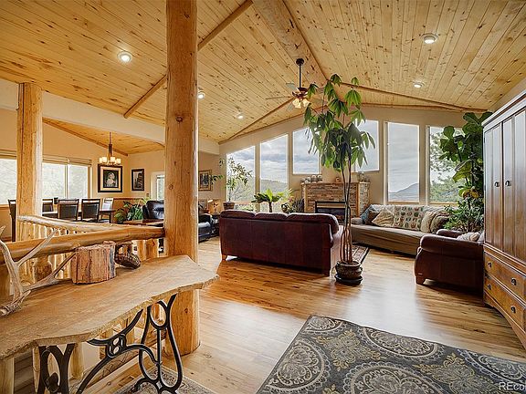 PRICE IMPROVEMENT! 50 Mile Snowcap Views are just one of the highlights you’ll find in this beautifully maintained home and horse property, featuring Pike’s Peak views to the south and Mount Rosalie views to the north. Tucked in a tranquil cul-de-sac on 5 pristine acres is this rare blend of rustic charm and modern convenience. Entering the beautiful foyer, your eyes are drawn across the great room to the expansive windows and those breathtaking views. Throughout the home, tile and newly refinished wood floors seamlessly complement warm wood vaulted ceilings and trim. The kitchen is a dream with granite counters, stainless appliances, plenty of counter space and stunning custom cabinetry. This was a builder’s home and the details combined with a warm, enduring aesthetic show the care taken in design and quality of construction. On the practical side, a new energy-efficient 8 zone boiler provides in-floor radiant heat. In late 2024, all buildings received new roofs, with updated gutters and downspouts on the main home. Enjoy the large deck spaces and expansive outdoor living areas designed for both sun and shade—perfect for entertaining or quiet reflection. Beautifully landscaped with native plants, expertly crafted flagstone pathways, everything integrates seamlessly into the natural surroundings, featuring megalithic lichen-covered boulders and majestic Ponderosa pines. A new 3-rail cedar fence with integrated coated wire ensures security for pets while keeping wildlife out. Equestrian enthusiasts will appreciate the barn/run-in shed, large paddock, 60'x100' outdoor arena, and pasture. A charming, predator-proof chicken coop (The Chicken Palace) offers generous space for free-range birds. With easy 30 minute access to the western metro area, 60 minutes to downtown Denver, 70 minutes to Denver International Airport or just 90 minutes to world-class skiing, it's the best of mountain living with modern comfort.