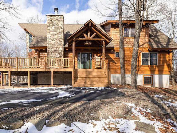 Introducing the Tanglwood Lakes Log Chalet, a pristine mountain retreat. Boasting 4 bedrooms plus a loft, 2 full baths, and a lower-level family room, this property offers ample space. The open floor plan seamlessly connects the glass-fronted living/dining area, featuring a floor-to-ceiling stone fireplace. The modern kitchen with an island is a culinary haven. Unwind in the primary suite with a private balcony. Meticulous details grace every corner, reflecting true craftsmanship. Serene outdoor surroundings complement the incredible interior. Embrace a blend of classic charm and modern living in this exceptional chalet. Lake rights to Wallenpaupack.