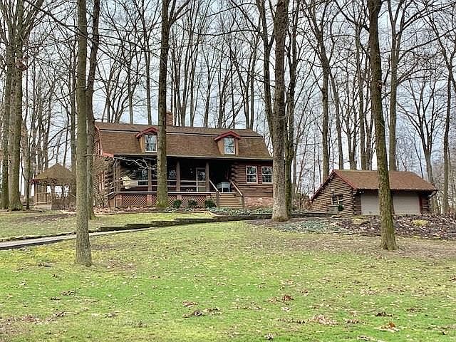 Log home in South Butler School District. New well 2017. Pine floors. Beamed ceiling in master bedroom. Stone fireplace in living room. Finished game room in lower level. Sliding glass door and 6 panel doors are newer. Newer roof. Wood Pella windows are newer. Hot water boiler 2009. Cement block and brick foundation walls. Walls are pine and drywall. Much of the lot is wooded.