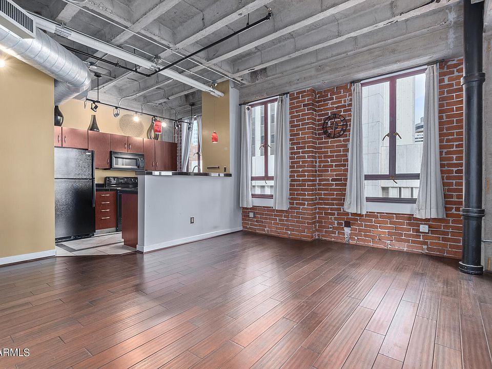 Orpheum loft, 7th Floor Unit! True 1 bed 1 bath Loft style condo w/ Spectacular Views of down town Phoenix! Beautiful wood flooring & brick walls throughout. The kitchen is open to the family room & includes granite counters, matching appliances. Full size front loading Washer/Dryer included! Newly renovated Gym with full size heated pool, sauna, steam room. Boardroom available by appt. Full security & maintenance on site. Internet included in monthly HOA. Option for secured parking. Shops, restaurants & Light rail are within walking distance.