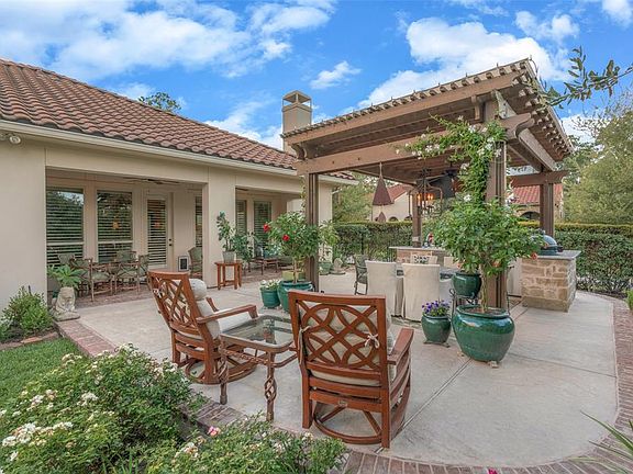 Exquisite single-story home on premium corner lot is loaded with customizations, only 5 years old! Don't buy new - this home is move-in ready and upgraded to max inside & out! Well-appointed home with lanai and custom pergola with loaded summer kitchen. Lush, manicured landscaping. Stone, stucco exterior with clay tile roof. Wood floors, plantation shutters, designer finishes throughout. Formal dining room. Study with French doors. Split floor plan with 3 bedrooms, 2.5 baths. Open concept has spacious family room with corner fireplace. Kitchen has oversized island with seating, designer backsplash, granite, stainless appliances including double ovens & 6-burner gas cooktop, & stained cabinetry. Master suite has his/her vanities, soaking tub, w/i shower, mosaic tile. Lanai has ceiling fans, TV. Pergola has room for dining & cooking with L-shaped granite counter, b/i grill, ceramic egg, sink, refrigerator, ice maker, chandelier, ceiling fan, TV, lush landscaping. Mosquito misting system.