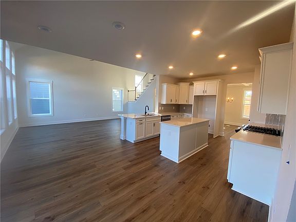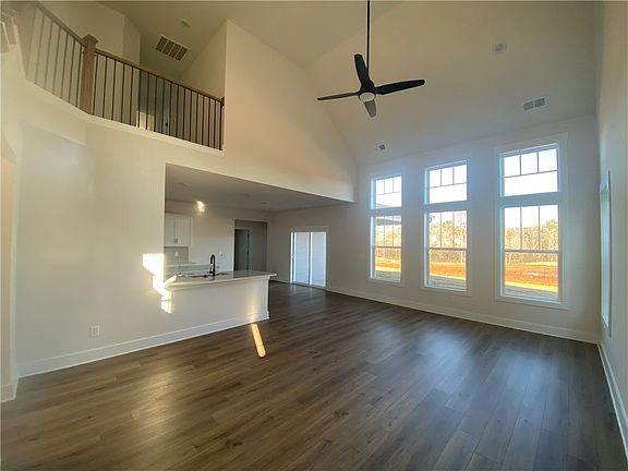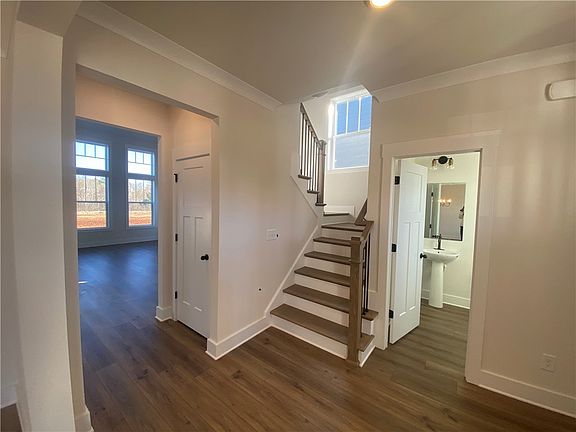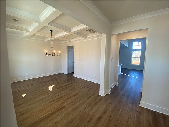 The Sutherland home offers almost 2600 square feet of luxurious living space, crafted for those who desire both comfort and sophistication. The expansive front porch leads to a welcoming foyer and an adjacent dining room with coffered ceilings. The seamless flow between the spacious family room and the well appointed kitchen is perfect for entertaining. The large windows in the family room give wonderful natural light and the high ceilings gives the room an airy feel.The gourmet kitchen has a peninsula with sink offering additional seating along with a large island for extra prep space. Other features include beautiful white cabinetry, white Quartz countertops, tiled backsplash, under cabinet lighting, and stainless steel appliances including a gas range/oven. The adjoining breakfast area leads out to the covered back porch which overlooks your backyard. The Primary Suite is also on the main level for added privacy. Enjoy a generous walk in closet and spa like bathroom with double vanities and a beautiful tiled shower with built in seat. Once you go up the grand Oak staircase with open rail that overlooks the living room, you will find three more bedrooms, all with walk in closets and two full baths. All our homes feature our Smart Home Technology Package including a video doorbell, keyless entry and touch screen hub. Additionally, our homes are built for efficiency and comfort helping to reduce your energy costs. Our dedicated local warranty team is here for your needs after closing as well.