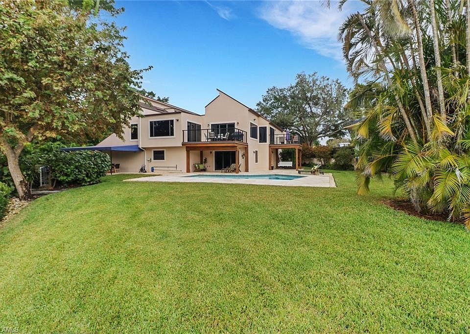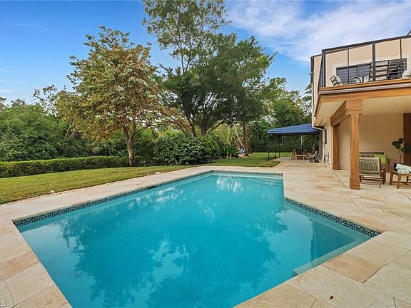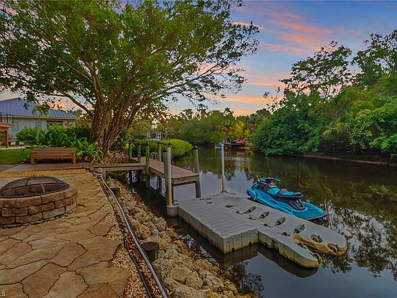 One of a kind waterfront property with 175 feet of river frontage taking you to the gulf of Mexico. 4 Bedrooms +Den/big entertainment area, 3.5 Bathrooms two story home, oversized two car garage with extra storage and pool. This is the ultimate Florida entertainment dream offering a great outdoor space with spacious pool, fire pit area with views of river as well as a boat dock you can keep your water toys. The interior of the home is completely remodeled with exquisite finishes. Starting out you are welcomed by large double doors into your foyer that leads to top of the line white oak stairs, 3 AC units 2018, roof 2018, new water heater, updated laminate flooring throughout main living area and epoxy concrete downstairs giving the home a modern touch. The gourmet kitchen offers granite counter tops and backsplash, convection cook top, stainless steel hood and appliances as well as custom cabinets with an enormous amount of storage space, in addition to the under cabinet lighting. Right off the kitchen is your convenient laundry room with sink and folding area and plenty of storage cabinets and a dumbbell elevator for convenience to the downstairs. Very spacious main bedroom with Ensuite bathroom is located on the main floor and offers a luxurious feel with soaking tub, large walk in shower, double vanity, bidet and oversized walk-in closet with custom built in cabinets and major island for storage. Additionally a powder room is conveniently located in the foyer area of the home and is great when you entertain. The downstairs offers 3 bedrooms and 2 bathrooms with one of the bedrooms offering an ensuite bath.Both full baths have updated walk-in showers with frameless shower doors and modern vanities. Sellers invested in heavy duty flood walls to assure the home is protected from all elements. Enjoy stunning sunsets and views from your two balconies as well as anywhere on the property. Palm River Estates is conveniently located close to shops, restaurants and the beautiful beaches Naples has to offer and you can take your water toys directly to the gulf from your backyard.