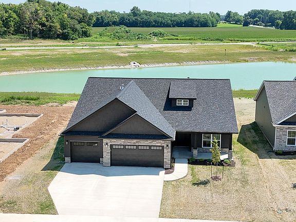 Welcome to the Sunset Retreat by Majestic Homes, located in the desirable new Bowen Estates subdivision. This stunning new construction offers a serene water view of the community pond and combines thoughtful design with modern finishes. The open-concept, split-bedroom layout is perfect for both daily living and entertaining. The kitchen features a spacious island, granite countertops, and a stylish tile backsplash. The luxurious master suite includes a dual vanity, tiled walk-in shower, and a massive walk-in closet with direct access to the laundry room for added convenience. Enjoy peaceful mornings and relaxing evenings on the covered back patio overlooking the pond. This single-story, low-maintenance home also includes an attached three-car garage for plenty of parking and storage. Ideally located just a short drive to Lafayette/West Lafayette, shopping, dining, and entertainment. Quality craftsmanship, beautiful views, and a functional floor plan make this home a must-see!