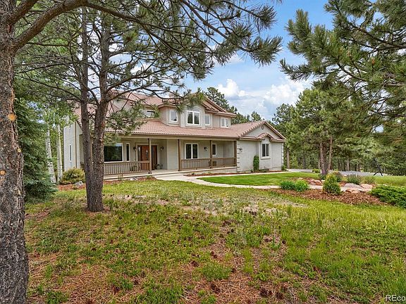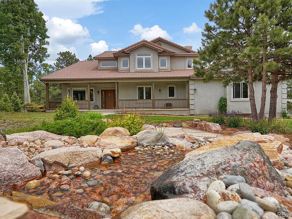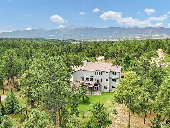 Stunning Bent Tree III custom home situated on 2.5 acres with a beautiful water feature in the front surrounded by tall Pines including Pikes Peak and Front Range views. Over 4,600 sq. ft. with a large gourmet kitchen including a center island, a breakfast nook with a walk-out to the composite deck, a formal dining room with wainscoting and a spectacular living room which opens to the grand foyer. The vaulted main level family room has a gas fireplace with built-ins and lots of windows to bring the outside in. The sweeping staircase brings you upstairs to a vaulted master suite that includes a gas fireplace, a 5-piece bath and a spacious walk-in closet with custom built-in cabinets and shelves, two additional bedrooms featuring a Jack & Jill bath with one having a large window seat for additional storage. The lower level features the office with built-in shelves, an additional bedroom which has a convenient sink with cabinet and drawers plus a walk-in closet and a separate storage closet. There's also a full bath plus the walk-out 25 x 17 family room which features a stacked stone wall with built-in cabinets and a gas fireplace. Extras including a water softener, a water neutralizer, a 105 gal. hot water heater, a radon system, crown molding, French doors, 9 ft.+ and vaulted ceilings, multiple gas fireplaces, tons of built-ins, A/C, hardwood floors, an awesome tree house in the back yard plus so much more. You don't want to miss this one!
