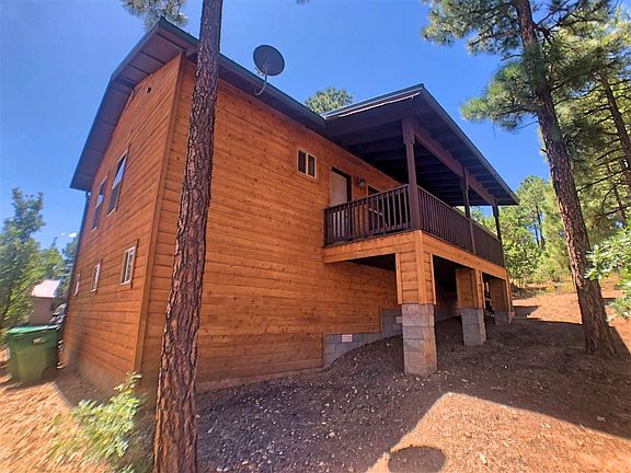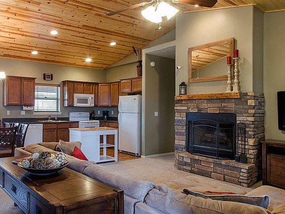 JUST REDUCED $10,000! Situated on a Quiet Cul De Sac Lot, you've just found the Rare 4 Bedroom Cabin priced below $300k! Escape your troubles & enjoy the views of mountain sky and pines from your front deck! Inside, fall in love with the Great Room, complete with towering T&G Ceilings, Rustic Wood Laminate Flooring, and Stone Fireplace. The kitchen is well equipped with plenty of Cabinet Space, Matching Appliances, Dining for 6, and Floating Island. With 4 BRs and 2 full BAs, there's room for the whole family, to entertain friends, or a successful vacation rental! The neighborhood backs to the National Forest, a 5 min walk from miles of hiking trails! Two covered Trex decks, low maintenance front and back yards, metal roof, Central AC, gas heat, attached garage with bonus storage. Read on: