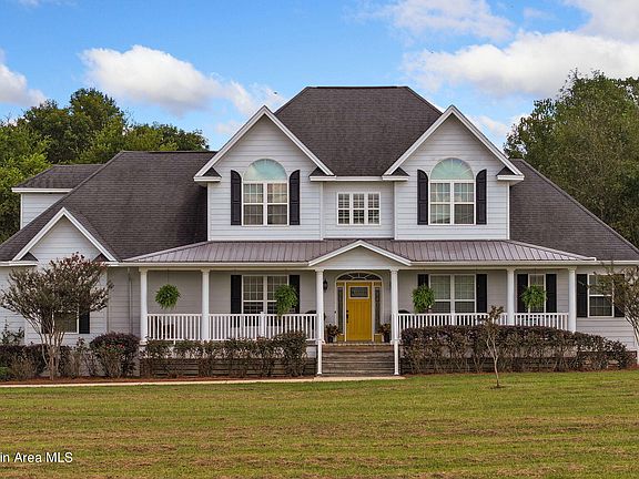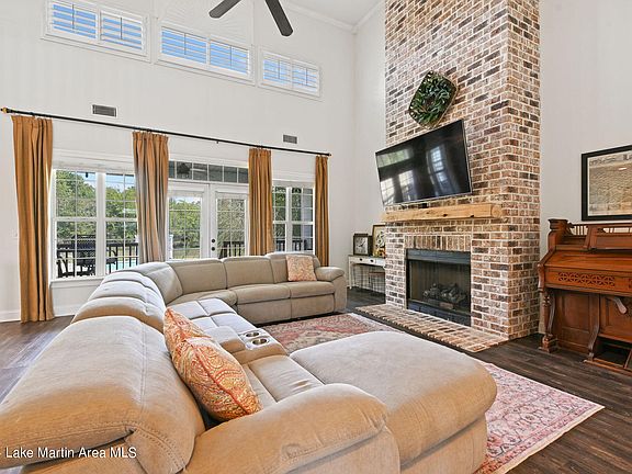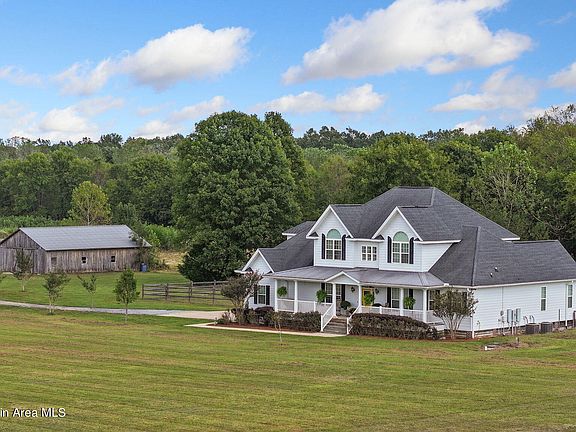 Nestled in the Foggy Hollow gated community and zoned for Pike Road schools, this charming white farmhouse sits on 14 acres with breathtaking sunset views. The inviting front porch spans the length of the home, offering a wonderful place to relax and enjoy the peace and quiet. Inside, an open floor plan features a two-story living room with ample natural light and a brick gas fireplace with a cedar mantle, creating a warm gathering space.
