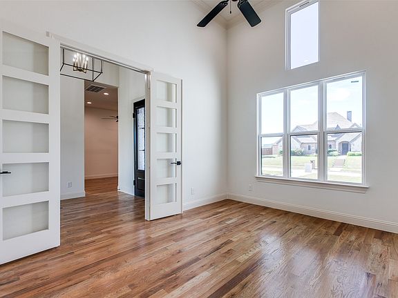 CUSTOM SINGLE STORY ON CORNER LOT in Golf Course Community with 4 bedrooms and 4 bathrooms, media room, study, exercise room, covered patio with wood burning fireplace, corner lot, hardwood flooring throughout. Spray foam insulation throughout, all LED lighting, Energy Star construction, pot filler in the kitchen over electric induction cooktop, living room fireplace is electric wall mounted with floor to ceiling decorative marble, all quartz countertops, custom cabinets, fully sprinklered landscaping. WALK TO THE NEW GUNTER ELEMENTARY SCHOOL ONE HALF BLOCK AWAY. MUST SEE SINGLE STORY IN GOLF COURSE COMMUNITY. FLOOR PLAN AND SURVEY IN DOCUMENTS