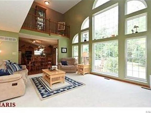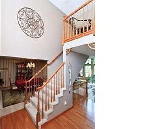 Stunning 1.5 story with a very nice backyard .almost a half acre. Main floor master suite with luxury bath with ceramic tile , dual vanities, separate tub and shower & a walk in closet.. Gorgeous two story windows with a lovely view of the trees. 2stry entry with hardwood floors. Large formal dining room. Beautiful vaulted kitchen with custom cabinets, center island, built in planning desk and wood floors. . Main floor laundry. Wood burning fireplace. Two wall alcoves, plant shelves, six panel doors.Three spacious bedrooms and a sitting area on the upper level. Finished walkout lower level with rec room/ media room, bedroom large full bath and an office with built in book shelves. Huge patio and large deck. Full brick front. One of the best lots in the subdivision. Huge private backyard with trees.