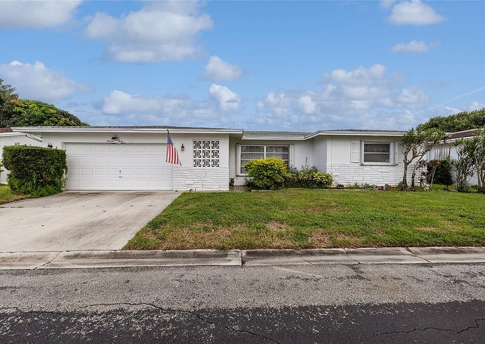 What distinguishes this house from the rest is it is rare inn this neighborhood to have a large two car garage and it is on the water, with a NEW roof: March '22, NEW AC: May '22, New Accordions in '22. Embrace waterfront living here in this single-family home, boasting 70+ ft of serene lakefront. TWO bedrooms, ample storage, TWO full bathrooms, captivating views of the lake from the kitchen, Florida room, etc. Access the clubhouse, and pool for more appeal. The layout: dining room, kitchenette, laundry room, with a blend of ceramic tile. HOA covers exterior landscaping - mowing, cutting and edging - simplifying your lifestyle. Per HOA rules, this home is designated for ages 55 and above—one owner must be 55+ years, and other permanent residents must be 18+ years. Please verify.