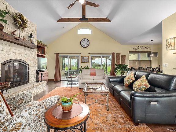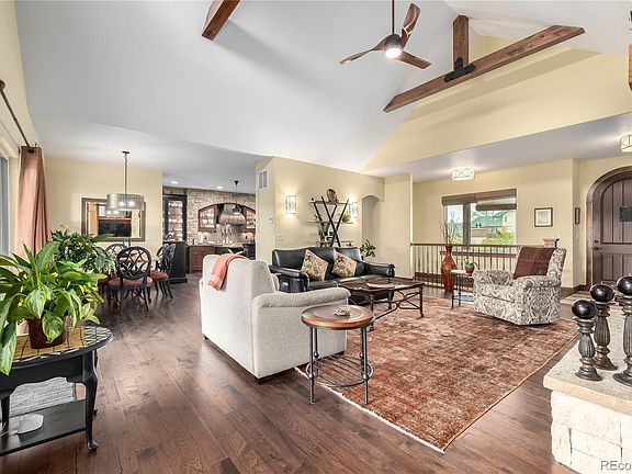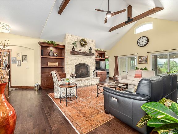 BREATHTAKING MOUNTAIN VIEWS! Welcome to serene living in Berthoud. This custom ranch-style home offers the perfect blend of luxury and comfort on an expansive 2-acre lot, complete with a riding mower for easy maintenance. Discover a chef's kitchen designed for entertaining, featuring custom alder cabinetry, granite slab countertops, and top-of-the-line Thermador gas stove and double oven. The large center island and walk-in pantry provide ample storage and workspace. Enjoy meals with a view in the eat-in kitchen nook overlooking the mountains. Step into the spacious living room with vaulted, beamed ceilings and a stately Austin cream gas fireplace. Two sliding doors lead to the outdoor living area, perfect for hosting gatherings or simply relaxing in the fresh air. Retreat to the main floor primary bedroom, complete with a cozy fireplace and ensuite bath featuring a luxurious Badeloft stand-alone tub and walk-in closet. An additional large bedroom on the main floor offers convenience and comfort. Work from home in the traditional office with built-in bay window seating. The finished basement provides additional living space with a wet bar, large bedroom, 3/4 bath, and a gym. Plus, there's extra unfinished storage area for all your needs. Outside, entertain friends and family on the covered deck, circular paver patio with a large pergola, and sunken circular patio with a built-in wood-burning firepit. Relax in the outdoor hot tub surrounded by stunning landscaping, including blue spruce, apple, plum, and maple trees. Located in the charming town of Berthoud, enjoy easy access to the only TPC Golf Course in Colorado, with close proximity to Loveland and Longmont. Fiber optic is installed in the subdivision, and the property is not in a metro tax area. Don't miss your chance to own this exceptional property! Contact us to schedule a viewing today.