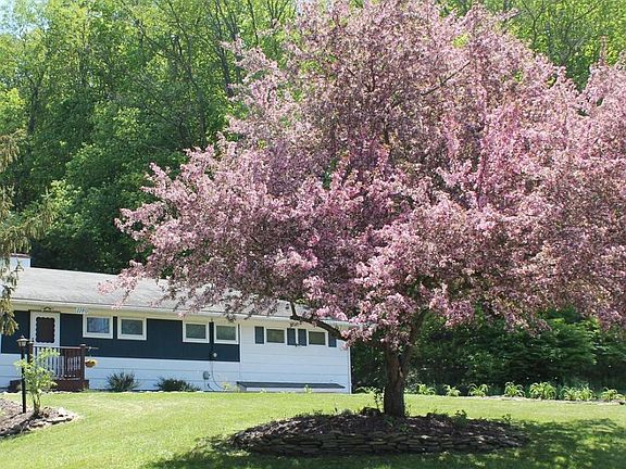 This cozy ranch is set on almost 2 acres, with a park just up the road.The property is partially wooded with mostly hardwood trees and a large yard with a covered patio and outdoor fireplace. The whole house has been recently renovated and includes 2 and a half baths, one of which has a walk in shower, built in vanity seat and a beautiful vaulted ceiling. There are 4 bedrooms, 2 large, 1 medium and 1 small that can be an office or bedroom. The basement is partially finished with a sleek laundry room, half bath, and large living space. The other side of the basement offers a workshop area.