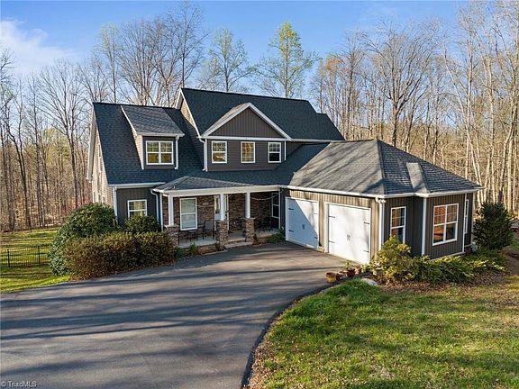 Welcome to your dream retreat in Yadkinville! This stunning property boasts a sleek, clean layout with distressed hardwoods throughout, creating an inviting and sophisticated atmosphere. The modern style kitchen features a farmhouse apron sink, quartz countertops, and soft-close cabinetry, offering both style and functionality. Set on 6.53 acres, the expansive yard space includes a fenced area perfect for pets to roam freely. Inside, you'll be captivated by the soaring 21-foot vaulted ceilings in the great room, accented by a beautiful stone fireplace. But that's not all, venture downstairs to discover a very cool recreation/home office space in the basement, providing endless opportunities for relaxation, entertainment, or productivity. The bathrooms feature solid surface countertops in luxurious limestone or granite, adding to the home's elegance. This property is truly a "must see" for those seeking luxury, comfort, and tranquility. Schedule your viewing today!