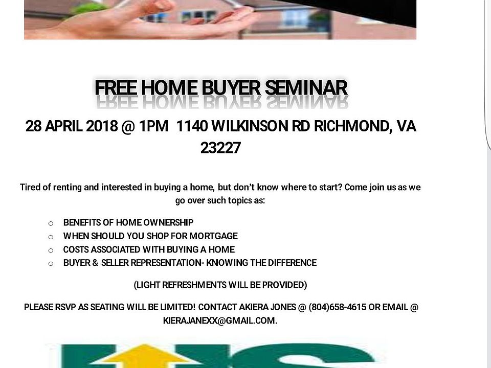 FREE HOME BUYER SEMINAR 28 APRIL 2018 @ 1PM 1140 WILKINSON RD RICHMOND, VA 23227 Tired of renting and interested in buying a home, but don t know where to start? Come join us as we go over such topics as: o BENEFITS OF HOME OWNERSHIP o WHEN SHOULD YOU SHOP FOR MORTGAGE o COSTS ASSOCIATED WITH BUYING A HOME o BUYER & SELLER REPRESENTATION- KNOWING THE DIFFERENCE (LIGHT REFRESHMENTS WILL BE PROVIDED) PLEASE RSVP AS SEATING WILL BE LIMITED! CONTACT AKIERA JONES @ (804)658-4615 OR EMAIL @ KIERAJANEXX@GMAIL.COM. ONE DAY EVENT