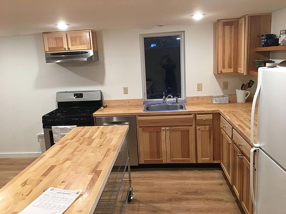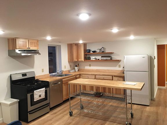 Mid century home basement unit 2 Bedroom with daylight windows, 1 bathroom, laundry room with storage, kitchen with refrigerator/freezer, gas stove/oven, and dishwasher. Island. Fireplace in living area with woodstove insert. Fully insulated. Radiant heat. Off street parking. Owner pays for garbage. Tenants responsible for all other utilities. No smoking allowed.
