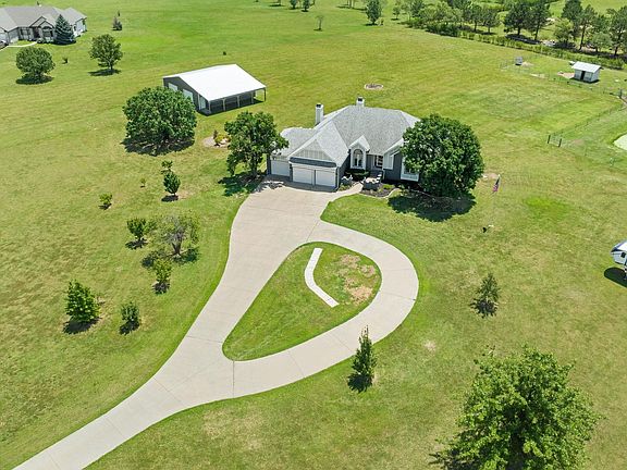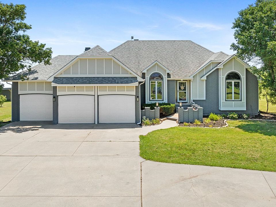 This stunning move-in ready ranch on 5.28 acres is conveniently close to Derby as well as Wichita and offers over 3300 finished square feet of luxurious living. Replacement thermo-payne windows, replacement siding, all new pristine classic shaker white cabinetry in kitchen & baths, gorgeous quartz countertops, all new flooring, all new hardware, & updated lighting guarantees a home that is both fresh & modern! Cozy ambiance is ensured with the 2 way fireplace between living & kitchen/hearth plus there is an additional fireplace in the expansive family room in the VO basement which also features a large wet bar perfect for gatherings. Note the large partially covered double deck with adjoining pool perfect for cooling off in the summer heat. You will love the long paved circle driveway which accommodates parking for multiple guests. The 40x40 outbuilding with 10' extension offers functionality for multiple uses with fully insulated barrier, 2 insulated doors, 4-5" concrete base, and 6 windows plus there are 2 additional small outbuildings. This property is a rare find for updating, luxury, space, and convenience.