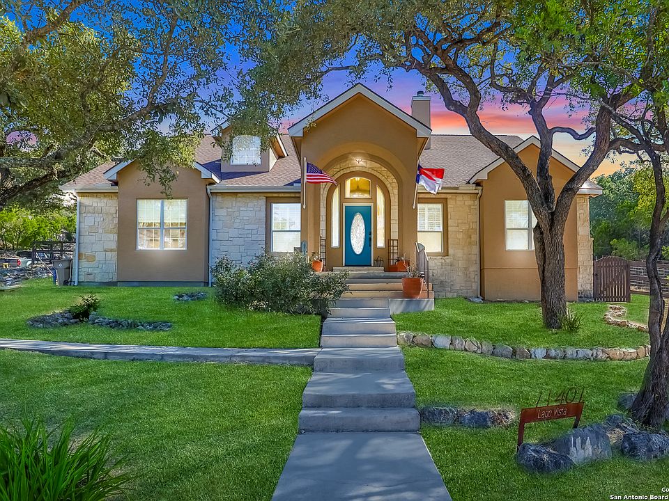 Imagine yourself at 11401 Lago Vista in Helotes, where modern upgrades meet Hill Country charm. Built in 2005, this spacious two-story home offers over 3,000 square feet of living space, featuring a 2019 roof and reliable HVAC system both with Nest Thermostats. The stone and stucco exterior is highlighted by programmable soffit lighting, guaranteed to make your neighbors green with envy. Inside, the chef's kitchen impresses with abundant counter space and high-end finishes, seamlessly flowing into the bright and open living area. The downstairs primary suite offers a private retreat with a luxurious jetted garden tub and separate shower. Upstairs, a versatile flex space serves perfectly as a home office or craft room, along with three generously sized secondary bedrooms. Wood stairs lead to lifetime flooring throughout. Smart home features, including a smart deadbolt, Nest Thermostats, and programmable lighting, add modern convenience and style. Overlooking Government Canyon, Plantation shutters adorn the first floor, and a spacious two-car garage rounds out this thoughtfully designed home. Nestled in the desirable San Antonio Ranch community, this home offers the perfect blend of Hill Country living with modern convenience. Come see it for yourself and be the envy of the neighborhood!