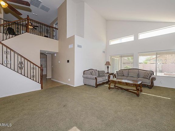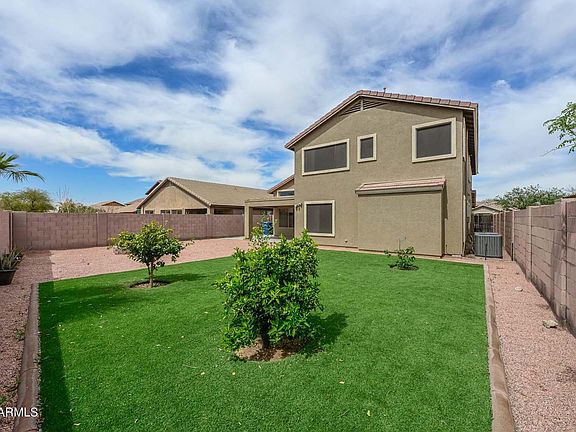 Welcome home to this 3 bedroom, 2.5 bath livable floor plan that boasts 2, 479 square feet of comfort, style and convenience. Great curb appeal with stone accents and low maintenance desert landscaping. Step inside to a spacious living/dining room with graceful staircase, vaulted ceilings and lovely windows with fantastic natural light. Really nice kitchen with large seating island overlooking the family room with cozy fireplace and a flex space that is perfect for a sitting room, den or play room! Upstairs you will find a loft space along with the master bedroom with en suite bath. Great outdoor living with covered patio overlooking the large fenced yard with artificial turf and fruit trees! Residents of this home enjoy easy access to a variety of shopping, dining and entertainment!