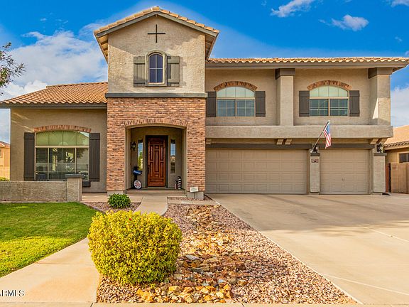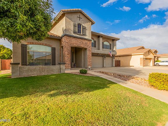 Pride of ownership certainly shows in the incredible corner lot residence in Gila River Ranches! Starting with an attractive façade providing a 3-car garage, RV gate, brick accents, and a private courtyard. Sheer beauty & mesmerizing attention to detail are found inside! Discover a bright & airy living room, formal dining room, designer paint, vaulted ceilings, and tile & carpet flooring. You'll love the family room equipped with a stylish wet bar and direct access to the back patio, great for indoor-outdoor entertaining. The kitchen exhibits gleaming stainless steel appliances, recessed lighting, granite counters, a plethora of cabinets & cupboards, an island with a breakfast bar, and a breakfast nook. Venture upstairs to find the HUGE loft ideal for an office or additional lounge. Oversized owner's retreat offers bountiful natural light, a walk-in closet, and an ensuite with dual sinks. Lastly, the serene backyard showcases a covered patio, grassy area, shimmering pool, and spa, perfect for those hot summer days. Welcome to your dream home!