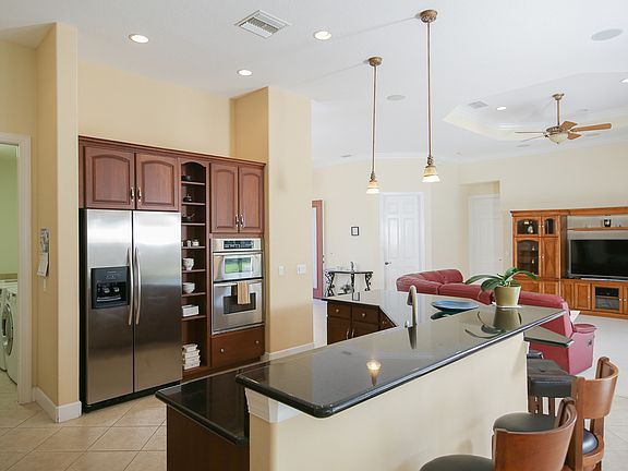 One or more photo(s) has been virtually staged. LIVE the Lifestyle! RIVER WILDERNESS. Coveted Savannah Lakes enclave, these properties rarely become available. LAKE view, Stunning home with 3 bedrooms plus DEN and 2 spacious baths. Newly installed HARD Wood Flooring in the Master, Living and Dining. Whole house just professionally painted (interior). The view from the great room is highlighted through the "stacking sliders" disappearing wall. Volume ceilings through out, custom lighting, crown molding, custom niches, blinds and plantation shutters, built in desk and MURPHY bed in DEN, exciting use of space with lake views from most rooms. Impressive entrance w/ lighted landscaping and paver walkways. Large, well kept garage with room for all the toys. Heavy duty overhead storage racks, a NEW water heater and a golf cart are INCLUDED because this is a fun, golf cart neighborhood! Ride the golf cart to the pool, fitness center, to the bar or dinner at the clubhouse, or take a short ride to the riverside park. Outside of the garage is an extra wide, paver driveway for overflow parking. The home has a split bedroom plan. The master bedroom is over sized with an extra sitting area & lake view, plantation shuttered access to the patio and 2 spacious walk-in his and her closets. The master ensuite bath has a 2 person soaking tub, a 2 person walk in shower as well as a toilet closet, double sinks w/long vanity solid wood cabinet. The spacious but very functional kitchen has all the bells and whistles, cook top, built in wall oven, etc...granite counter tops and solid wood cabinets with soft close drawers, pantry in kitchen etc... A large laundry room also has 2 extra pantries, includes the front load washer and dryer, has a utility sink and many storage cabinets with Quartz counter tops for laundry sorting. The main living areas (great room, dining, dinette and kitchen) are part of a sweeping open concept with lake views and access to the lovely, paver patio area (covered and uncovered screened sections). On the patio you will find a stone fire pit with surround seating as well as a state of the art hot tub/spa with hydro jets and an exciting multi light/waterfall feature. The hot tub/spa has an existing 6 (more) years warranty that can be transferred. Just outside of the patio is a paver BBQ area for your grill. The patio has terrific lake views but is also very private due to the expert landscaping. The outdoor, landscaping lights present a warm and exciting atmosphere in the evenings for a party or just relaxing in the spa. There is ample room for a pool if desired. There is a newly updated sprinkler system. And a new hot water heater. If you have an RV, love to boat or fish? If GOLF your thing? Dry dock storage for your boat and secure parking for your RV is available in the neighborhood, through an HOA request. First class golfing, great clubhouse and social networking, sparkling pool and fitness center if you desire through membership in the Club at River Wilderness. This neighborhood has all that and much more!! And if you prefer quiet and privacy, Savannah Lakes enclave is the perfect place, with only 2 lakes and very few houses in the enclave. The HOA includes Manatee River direct, private access for residents of River Wilderness. The seller has just added a whole house, 1 YEAR home warranty for your piece of mind. Many wonderful upgrades have been made to this very well built, impressive yet livable home. Come take a look, this is your dream home and location!