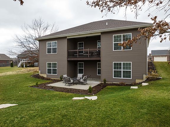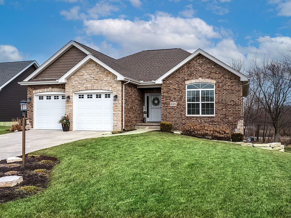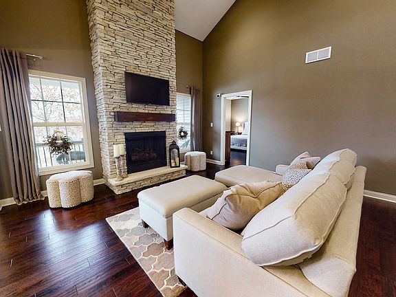 Be sure to take the Virtual Tour! Hillside Ranch with 4 bedrooms and 3 bathrooms. Main floor features Great room with vaulted ceilings and stone-front gas fireplace. The Kitchen has beautiful soft-close cabinets, large Island, and Natural Edge granite countertops. The Breakfast Room overlooks the large backyard with lovely seasonal views and oak trees. Sliding glass doors open to the covered porch. Owner's Suite has a large walk-in closet and ensuite bathroom with Custom Tiled walk-in Shower. The Main floor also has 2 additional bedrooms, full bathroom, foyer and finished laundry room. Hardwood flooring throughout, with ceramic in bathrooms & laundry room. Solid Oak stairway leads to walkout lower level with large Rec Room, a 4th Bedroom with walk-in closet and additional 3/4 bath. Vinyl planking throughout finished area. Sliding glass doors here lead to large concrete back patio. The unfinished storage space offers plenty of storage, & hook ups for a 2nd laundry room and sink.