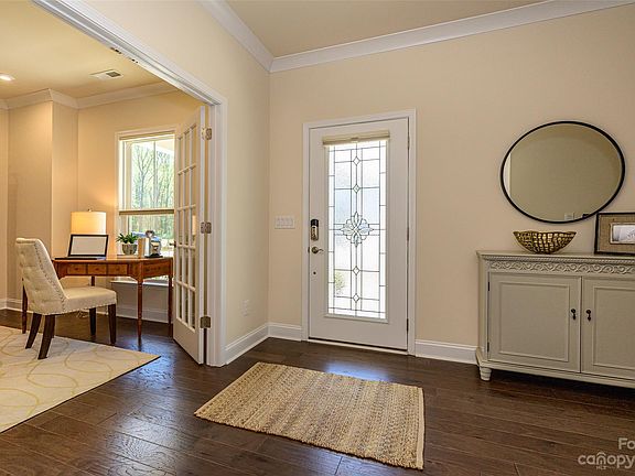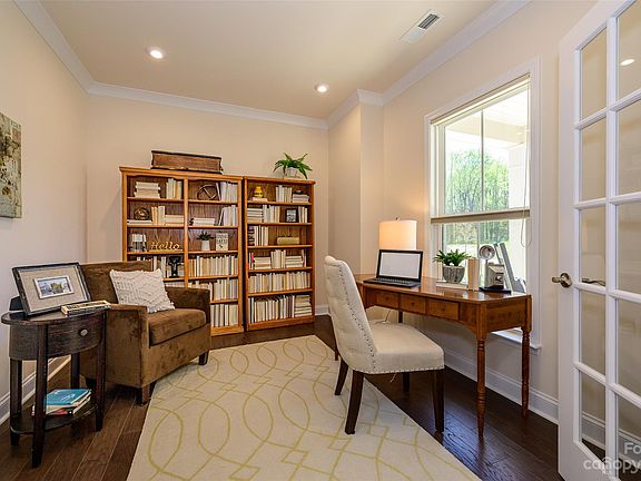 Fantastic cul-de-sac home features home office, loft, and unique home command center! This almost-new home offers a spacious open plan with chef's white kitchen, great storage, quartz counters, breakfast bar, w/ wide plank hardwoods throughout downstairs. Living/dining area has huge windows for great natural light and honeycomb up/down shades, overlooking a forest of trees! Command center off kitchen features built-in counters perfect for homework/home office! Separate office w/French doors for privacy. Ample bedrooms up including large primary w/lux bath and walk-in closet. Huge loft could be made into a great 4th BR with a little drywall! Enjoy the east-facing back patio offering privacy, peacefulness. Watch deer feeding in the forest! The wide fully fenced backyard offers great space to play on either side of the house, with low maintenance. 2 car garage w/addt 15x11 storage. Easy stroll to Waverly shops, Whole Foods & restaurants via the neighborhood! Low Matthews taxes!