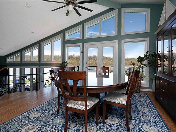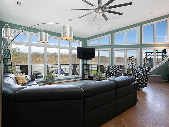 A once in a lifetime opportunity to own a river retreat! This contemporary style riverfront home sits on 1.3 pristine riverfront acres in Oldham County. The panoramic views of the water from the house must be seen in person to believe. The focal point of this 3 bedroom 2.5 bathroom home is the open living room with soaring ceilings and tall windows. The master bedroom with scenic views of the Ohio River has a bathroom featuring a large tub and beautifully finished walk in shower. The exquisitely laid hardwood floors that cover the main levels of the home is a must see. Relax on the large multi level deck or one of the many other sitting areas close to the water. The 2nd full bathroom was recently renovated with all of the most modern finishes. There is plenty of additional room for other toys: a parking space beside the house for your boat in the winter and a two car garage that is much deeper than standard. A bonus for any boater this property is directly across the street from Tartans Landing Marina with a boat slip included with the purchase. Because the property sits on two separately deeded lots, the possibilities are endless. Experience this home in person by calling for your private tour.