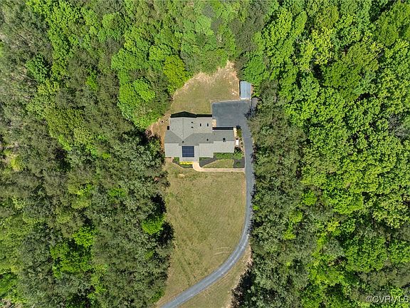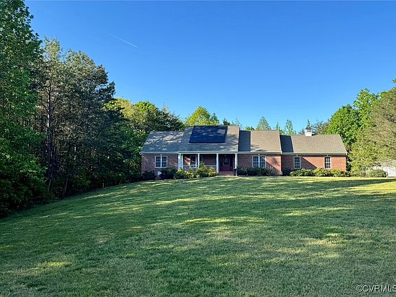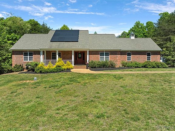 Welcome to serene and secluded country living on almost 6 acres of land in Hanover county! Drive down the paved private road to the paved private driveway that welcomes and winds you along the property to this 4 bedroom, 2 bathroom all brick rancher with charming cupola weather vein. Enjoy pastoral views on the covered front porch, step inside the foyer with wainscoting & French doors leading to vaulted ceilings, wood floors throughout, and an expansive dinning room perfect for large gatherings and entertaining, open to the Kitchen with breakfast bar, another dining area and pantry. The private primary bedroom has 2 closets with en-suite bathroom, double vanity, tiled shower and garden tub. The cozy family room has a brick, gas fireplace, sky lights & French doors that lead out to the added 3 season porch with lots of glass windows and more sky lights. There are 3 additional bedrooms with another full bathroom with double vanity and tub/shower. The utility room is large with washer/dryer hook up and a utility sink. The 2 car garage has a quiet closing mechanism with lots of storage and additional lowering shelving. There is a retractable awning off the garage perfect for shade and enjoying outside. One of the standout features of this home are the solar panels, which offer numerous benefits. With these energy-efficient panels, utilities are significantly reduced and you’ll enjoy the peace of mind that comes from generating your own clean energy. These solar panels not only contribute to a sustainable lifestyle but also increase the property’s value and appeal to environmentally conscious buyers. You’ll also find a separate storage shed with electricity, 2 car ports, and conveniently a whole home generator. Zero turn lawn mower conveys. While extremely private, and surrounded by neighboring privately owned properties, this home is also conveniently located 10 minutes west of Short Pump, close to interstates, as well as modern conveniences. Schedule your showing today and make your country living dreams come true!