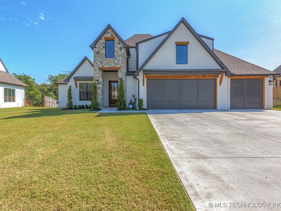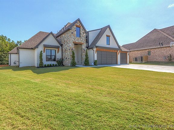 Stunning custom-built home in a premier Jenks gated community! Built in 2023, this home stands out from new construction with extensive upgrades and high-end finishes that add both style and functionality. This 4-bedroom, 3.5-bathroom home with a 3-car garage features a thoughtfully designed layout with soaring ceilings, designer fixtures, custom hardware throughout, and premium details. Step inside to a two-story entry leading to an expansive open-concept living space. The gourmet kitchen boasts an oversized island, premium appliances, a 5-burner gas range, a butler’s pantry, and elegant finishes. A floor-to-ceiling brick fireplace serves as a breathtaking focal point in the living room. The primary suite offers an expansive walk-in closet, instant hot water in the master bath, and direct access to a mudroom and utility room. Additional highlights include a dedicated office with exposed beams, a spacious game room, and hardwood floors throughout the main level—no builder-grade finishes here. Situated on an oversized lot with room for a pool, the property backs to a wooded area with a partial greenbelt for added privacy. The vaulted, oversized covered patio features a gas fireplace and gas grill hookups, providing the perfect setting for outdoor entertaining. Thoughtful smart-home features include auto blinds on all windows (blackout in bedrooms), an EV charger, a full security system with keypad entry, and motion-activated lighting. This home has been enhanced with a dual-temperature wine cooler for red and white wines, a tankless water heater, custom Christmas lights, a sprinkler system, gutters, a fully fenced yard, and professionally maintained landscaping. Located in the highly desirable Jenks West Elementary district, the gated community offers secure access, two fishing ponds, a playground, a splash pad, walking trails, and a covered school bus stop. Skip the hassle of builder upgrades—this home is already better than new!