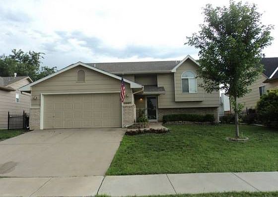 What a find in Maize Schools and NO SPECIALS! This Contemporary home has been updated and is ready for new owners. Inviting tiled foyer leads into the freshly painted living room with neutral frieze carpet, gas fireplace surrounded by windows and surround sound with built ins for all unsightly components. The kitchen is a WOW...granite farmers style sink, upgraded laminate, full tile backsplash, tile flooring, lighted cabinet and all the appliances stay including a Bosch dishwasher and large fridge. Two spacious bedrooms and lovely updated bathroom finish off the main floor. Moving downstairs to the wide open recreation/family room, with everything wired for surround sound and flat screen TV, dry bar and glass shelving...Perfect for entertaining! Large bedroom, bath and 4th bedroom/office (no egress) make this an ideal size home for starting out. The lot is fabulous, enjoy the lake view from the covered deck! Other amenities include new roof, updated lighting, knockdown ceilings, whole house surge protector and new garage door opener. Move right in and enjoy this great home in great neighborhood!
