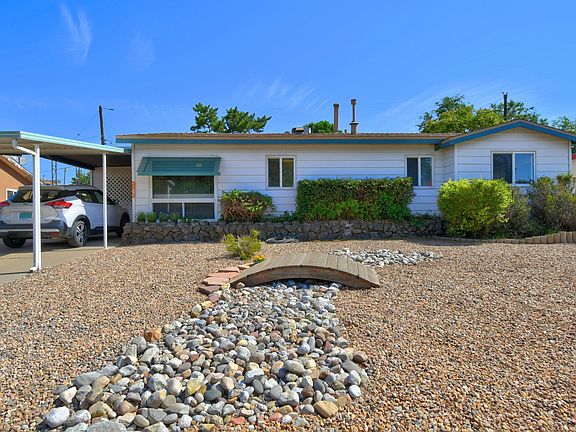 NE Heights gem with REFRIGERATED A/C near Kirtland Airforce Base. 3.75% Assumable Loan. Updated & lovingly maintained 3-bedroom, 1-bath home features a large yard with new landscaping, a pergola covered patio with a striking wood ceiling that invites alfresco dining creating a serene outdoor oasis with Sandia Mountain views. Sweet kitchen faces the amazing, lush green park with a breakfast bar open to the living room. Two living areas make this a flexible floorplan that adapts to your lifestyle. Use one as a cozy den, home office or fourth bedroom with patio access & the other for entertaining. This charming home has newer windows, laminate, carpet & tile flooring, updated electric panel & gas line, sprayed attic insulation for energy efficiency & new roof in 2021. New custom yard gate!